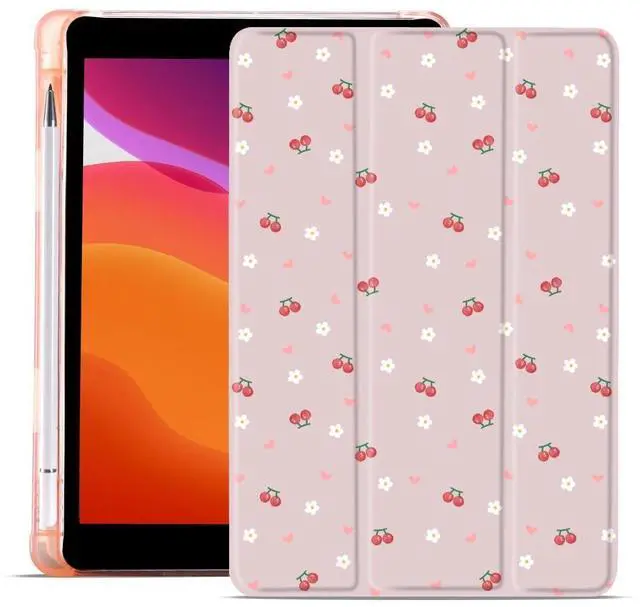 MAYCARI Pink Heart Cherry Flowers Fashion Case for iPad 10.9 inch 2022 with Pencil Holder, Original Pattern iPad 10th Generation Soft TPU Back Protective Cover Shell, Auto Sleep/Wake Slim Shell - Pink