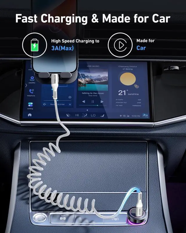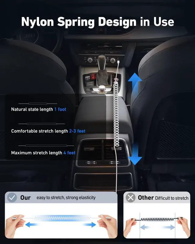 USB C Cable: This coil cable is designed with retractable spring design, no tangle, no knot, not taking up space and easy to carry and use. The automatic rebound design for car charging saves space on the center console and avoids clutter. It is perfectly compatible with Apple's CarPlay and Android Auto, with fast charging and data synchronization. ^^ Stretchable Length and