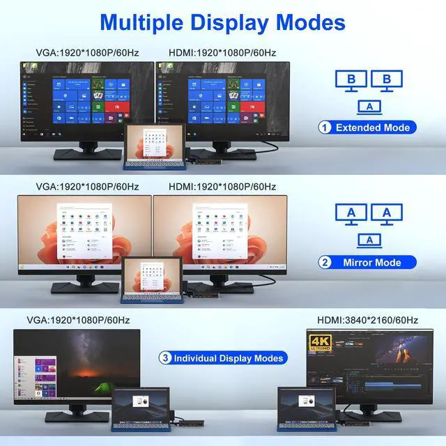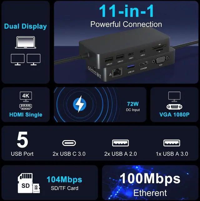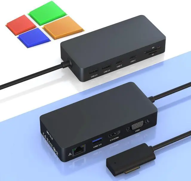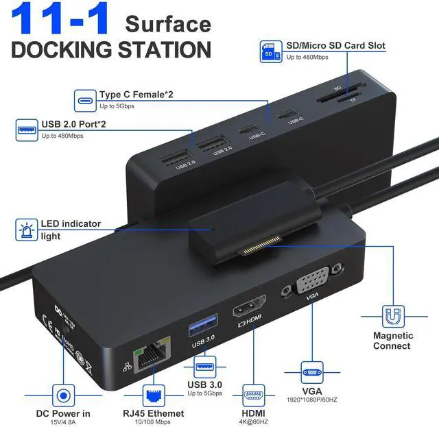 11-in-1 Surface Docking StationThe 11-in-1 triple display surface dock equipped with Surface Connect technology, this Surface docking station expands your workflow with: HDMI*4K@60Hz, VGA*1080P@60Hz, 100Mbps RJ45 Ethernet port, 2x USB C data port, USB A 3.0 Ports, 2x USB 2.0 Ports, SD/TF Micro SD card slot, 72W DC Power Port, Surface dock With simple plug and play connectivity. ^^ Triple Display Surface Pro docking station with 4K@60Hz HDMI Output This MS Surface Dock hub expanded dual Displays with 4K HDMI ports (3840x2160@60Hz) and a Full HD VGA port (1920x1080@60Hz), supporting extended/mirrored modes.