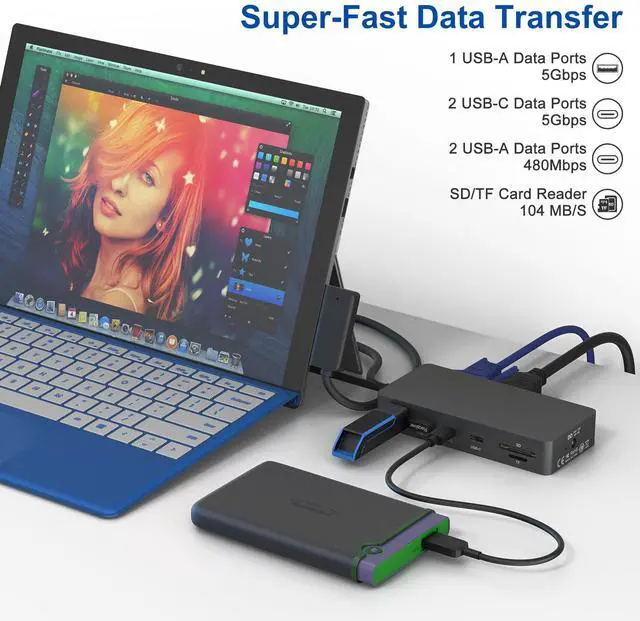 Please note: All resolution will be 1080P@60Hz if VGA is connected. ^^ Broad Surface Device Compatibility This Surface Docking station with surface connection technology, is widely compatible with Surface Pro 11/10/9/8/X/7/6/5/4/2017, Surface Laptop 7/6/5/4/3/2/1, Surface Laptop Go 3/2/1, Surface Book 3/2/1, Surface Laptop Studio 2/1,. (Please connect the power supply port when using) ^^ Fast Charging & Stable Network with Surface DockOur Surface dock features a DC 15V/ 4.8A power input, supporting up to 72W fast charging, enjoy faster charging speed and improve your office efficiency. The 100Mbps RJ45 Ethernet port guarantees stable, low-latency internet, ideal for streaming, downloading, and file sharing. A must-have Surface Pro docking station to boost your efficiency while working or gaming. ^^ Super Speed Data Transfer Surface Docking StationThis Surface Pro docking station comes with 1*USB A 3.0 (5Gbps) and 2*USB C data (5Gbps) ports, allows you to connect keyboard, mouse, USB flash driver, USB C hard disks, etc. And extra SD TF ports allows you to read or download photo and video from your camera with up to 480Mbps speed. Brings you much more convenience and save your time.