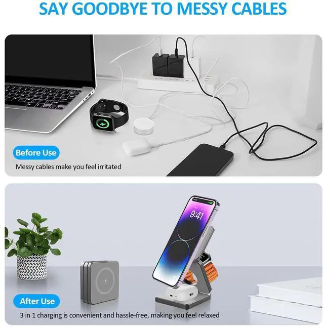 Wireless Charger Station: This 3-in-1 wireless charger is designed to work seamlessly with a variety of devices, including iPhone 15 14 13 12 Pro Max Mini Plus Series, Apple Watch Series 9 8 7 6 5 4 3 2 SE, AirPods 2 3 pro pro 2 (Note: for Airpods 2 3, needs work with a wireless charging case). A perfect gift for your family or any loved ones.