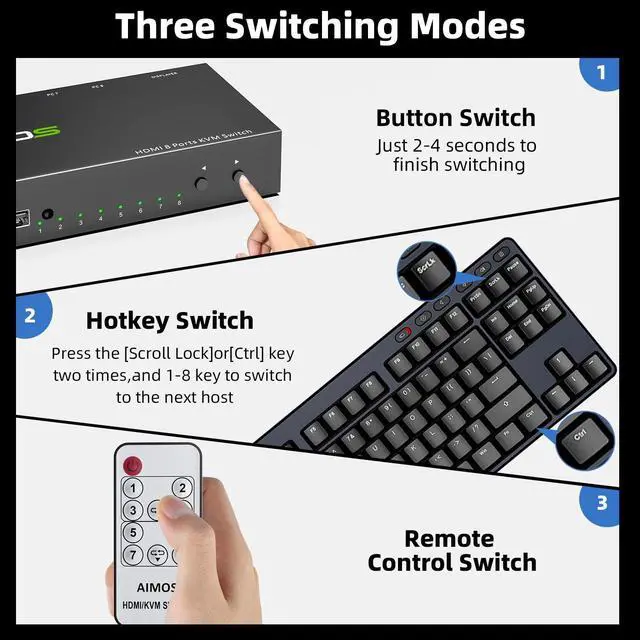 Note: The device is unable to switch between Bluetooth mice and keyboards that do not come with a USB receiver. ^^ Ultra HD 4K@30HzThis USB 2.0 KVM switches HDMI support resolution up to 4K@30Hz, not support 4K@60Hz, of course it also support 3D and 1080P or lower resolution. ^^ Great CompatibilityPlug and play, 8 computers KVM Switch driver-free for Windows 10 / 8.1 / 8/7 / XP / Vista, Mac OS, Linux, etc.. Compatible with most HDMI devices such as PC, Laptop, PS4, PS3, Nintendo Switch, etc. Widely used in office meeting, media teaching, security monitoring, home theater, etc. ^^ 3 Switching MethodsThe 8 ports HDMI KVM switch supports three switching modes: button switch, remote control switch and hotkey switch. LED indicate the active computer.