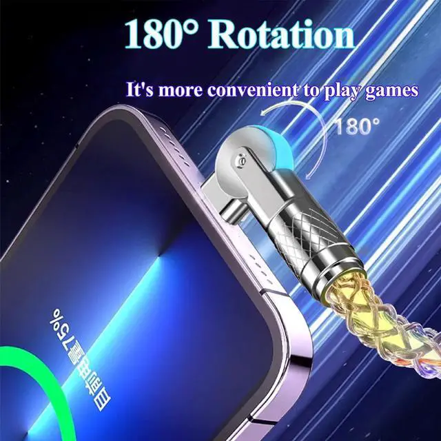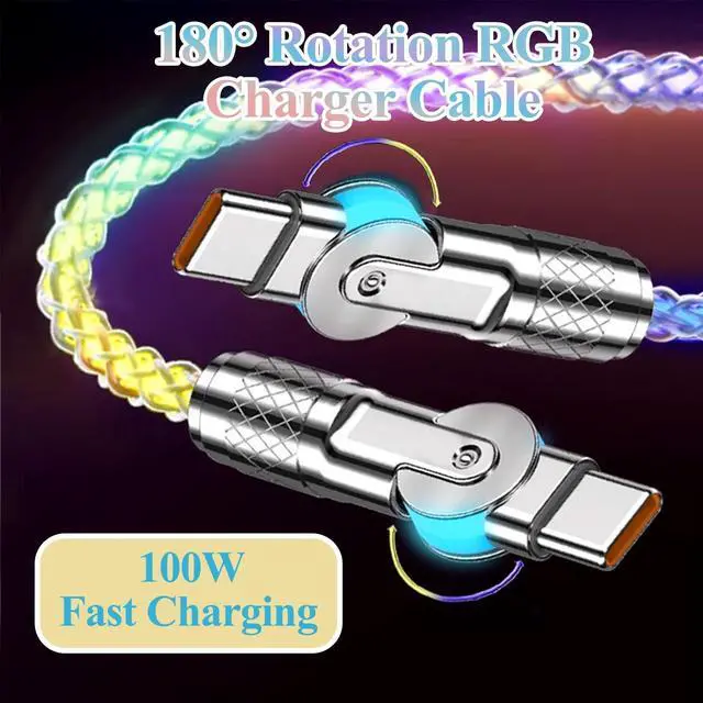Innovative 180 degree double head rotation DesignThe USB-C to USB-C 180 degree double head rotatiocable prioritizes your comfort, curating an effortless connective experience with its user-friendly180 degree double head rotatio design to enhance your daily plug-in moments. ^^ RGB Flowing LED Light UpRGB LED Glowing Gradual Colorful Light Up Flowing charging cable is compatible with Most Cell Phones port devices. New upgraded luminous design, when the LED usb c to type c cable is plugged into the PD/QC power adapter supply, the charger cable is like breathing by itself. ^^ 100W Fast Charging Cable and Data Transfer 100W Light up charging cable adopts pure thick copper inside and smart chips, which makes charging speed up 50% than usual charging cable.