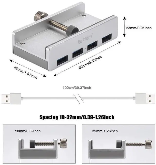 Clamp Design Hub: The USB 3.0 hub is equipped with an adjustable and strong screw clip, can fit the thickness from 0.39 to 1.26 inches (10-32mm, please note). It allows you to fix it on the edge of the desk or computer screen edge, very easy to install tightly and it wont lose with the rubber cap at the top of the screw ^^