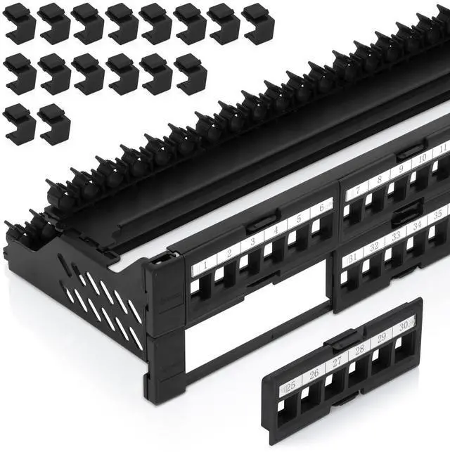 Product 1 - 48 Port Keystone Patch Panel (1-Pack) - Use with Slim Profile Keystones ONLY (Wider Jacks May not fit Side by Side) - Snap-in Design with Adjustable Rear Cable Management Bar