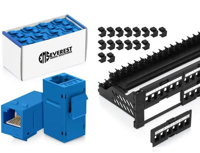Bundle 2 Items: 48-Port Keystone Patch Panel + 48 Pack of RJ45 CAT6 Keystone Couplers - Blue
