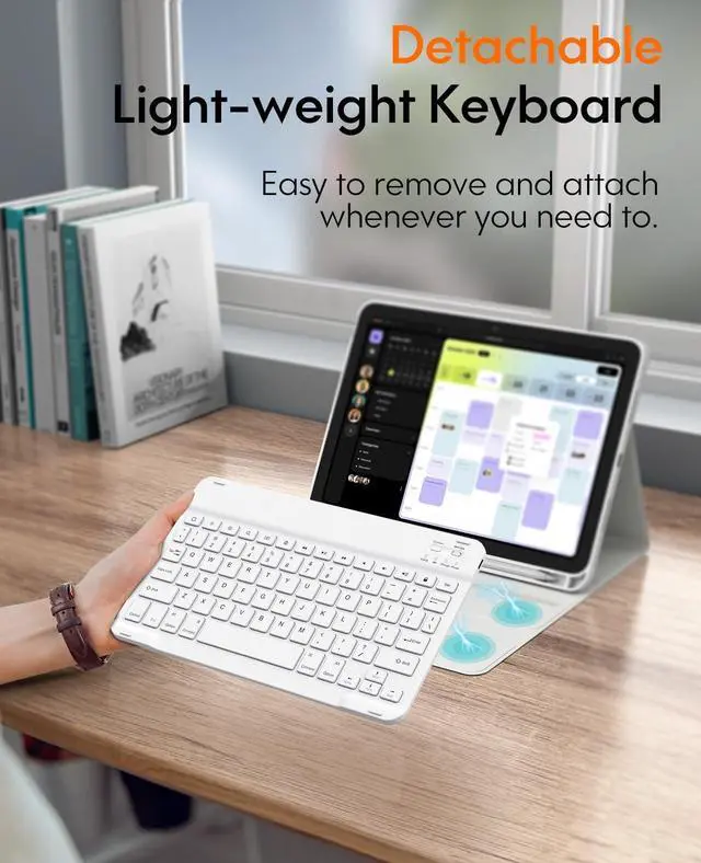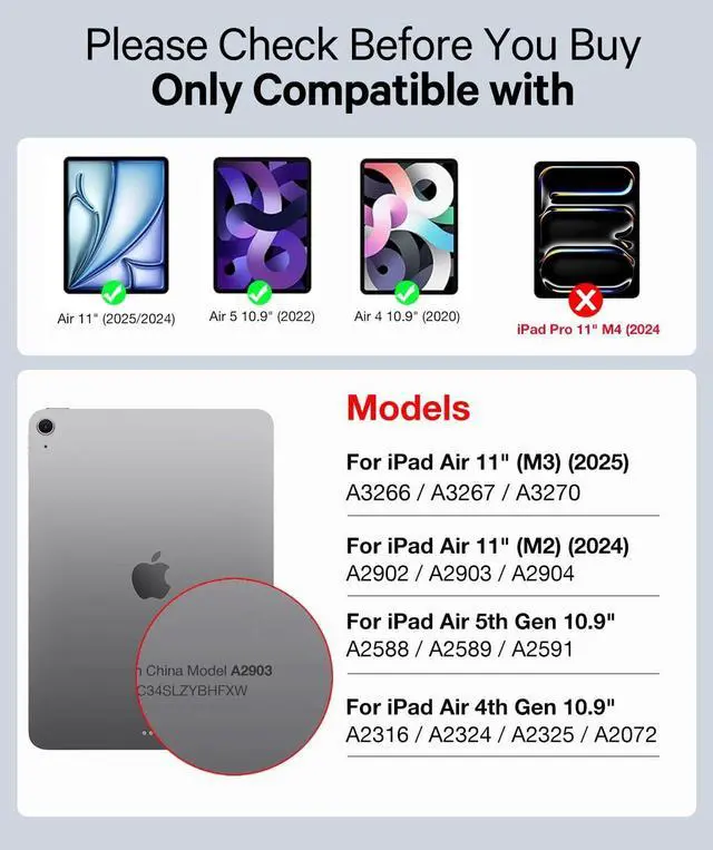 CompatiblityCompatible with iPad Air 5th Generation 10.9 inch 2022 (A2588/A2589/A2591) / Air 4th Generation 10.9 inch 2020 ( A2072/A2316/A2324/A2325 )/ Air 11 inch Generation 2024 (A2902/A2903/A2904)/Air 11 inch Generation 2025A3266/A3267/A3270). Perfectly supports Wireless Charging for New Apple Pen, Built-in pencil groove to place the pen when fully charged. Please kindly check the model number on the back of iPad before purchasing. ^^ DETACHABLE MAGNETIC KEYBOARD Air 5th Keyboard Case comes with Detachable Wireless magnetic keyboard can let you switch back and forth between a lightweight laptop and tablet. A laptop-like keyboard with a full row of iPadOS shortcuts are ergonomic and comfortable.