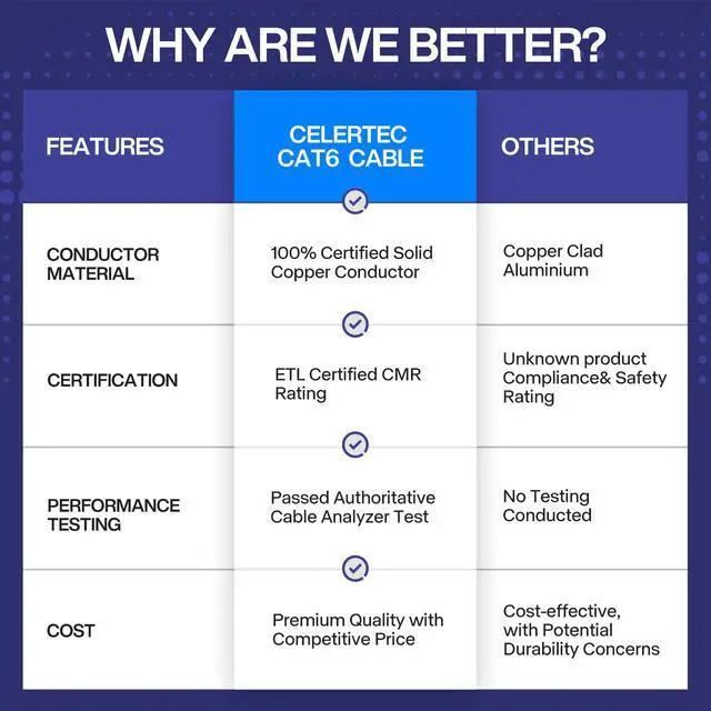 DELIVER FUTURE PROOF SPEED AND PREMIUM CONNECTIVITY SOLUTIONS. celertec Cat6 Ethernet cable is tested to 550MHz bandwidth. Perfect for 1Gb networks and 10Gb speeds at shorter distances. It supports PoE and VoIP applications. Compared to Cat5e, Cat6 cable provides higher performance and headroom and features more stringent specifications for crosstalk and noise. celertec Category6 is an ideal choice for upgrading your home or office for high speed network. ^^ SOLID BARE COPPER CONDUCTOR. All celertec Cat6 cables are made of solid bare copper as opposed to copper clad aluminum (CCA) wire, for full compliance with TIA/EIA 568-C.