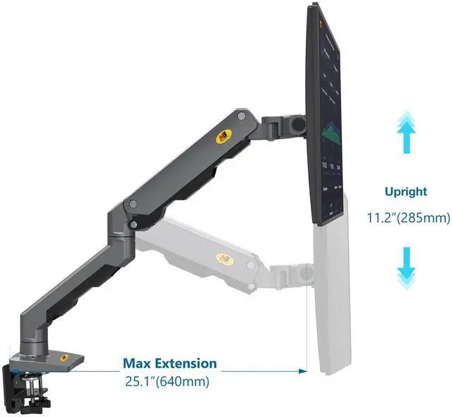 FULLY ADJUSTABLE: Tilt angles +15 to -60, Swivel angles 90and 360 Rotation, Max upright 11.2" (285mmm) and max extension up to 25.2" (640mm). Fully adjustable to ensure your comfortable. The weight of the product is near 6KG/pcs, Made of real metal stuff, This the most study monitor you can find in the market. ^^
