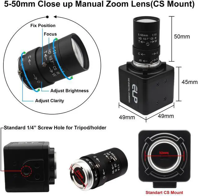 Manual Varifocal Lens: 1080p usb camera with 10X optical zoom lens, standard CS mount lens can be changed. 2MP usb webcam with 5-50mm manual varifocal lens and aluminum mini case, they can obtain different angles of view, different sizes of images, and different scene ranges by adjusting the focal length.