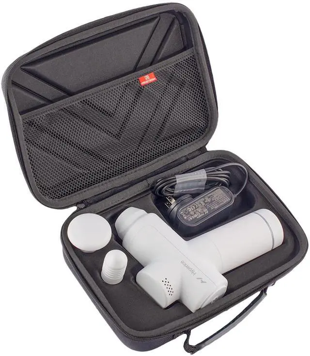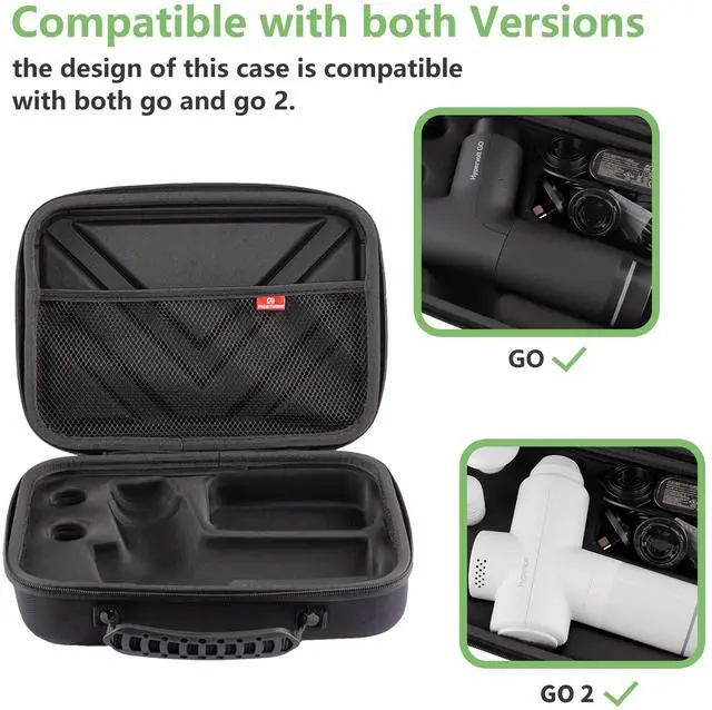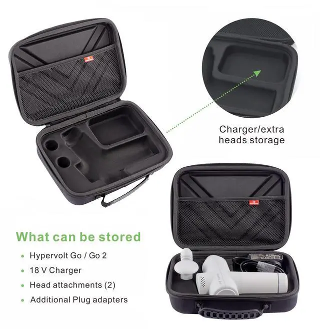 What can be storedDesigned for Hypervolt GO/Hypervolt GO 2 massage gun. it has 2 attachments slots, Additional 3 Plug adapters and 18V battery charger slot, Internal Mesh Pocket Some small accessories like keys, USB cable can be put into together, it's also Can Store Your Towel, Gym Gloves, Earphones etc. ^^ Material High-quality EVA material for scratch protection, smooth coating for comfortable grip, It has small volume, good seismic resistance and is easy to carry. ^^ Easy to carry everything around, If you want to take it to the gym or work, portable case and custom foam keep Hypervolt Go double safety.