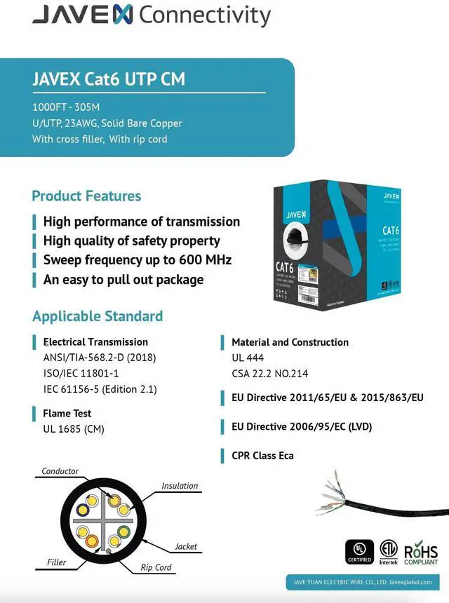 [High-speed Shielded Transmission] JAVEX Cat6 23AWG UL Certified ethernet cables meet upto-600MHz performance to support data transmission and comply with IEEE 802.3 af (PoE) / IEEE 802.3 at (PoE+) in structure cabling for horizontal and building backbone ^^ [Bare