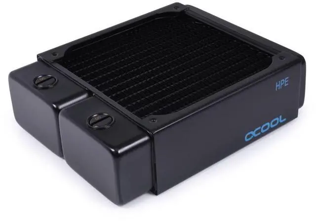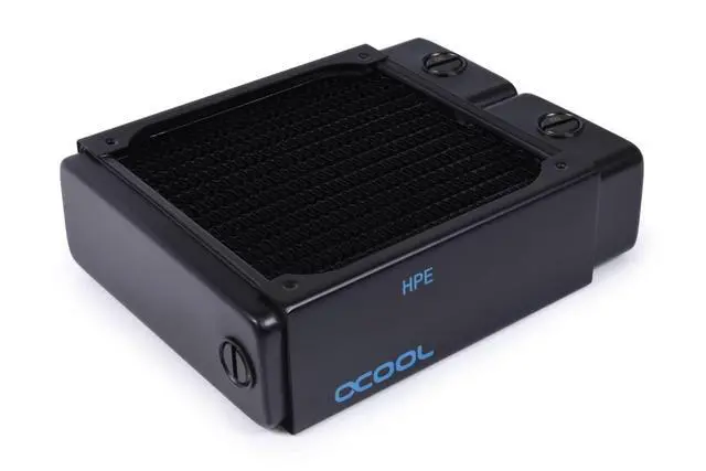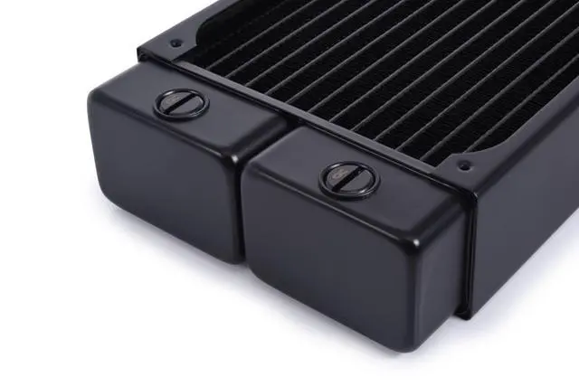 (* Test setup: NexXxos ST30 360mm radiator vs. NexXxos HPE-30 360mm radiator with Eisbaer cooler and 3x 120mm Rise Aurora fans and on Asus Prime x299 motherboard with Intel i9 10900x CPU with 350W waste heat) Connection options & mounting The NexXxoS HPE radiator has two IN or OUT connections with G1/4" threads in the pre-chamber area. On the opposite side is a fill or drain port, which can be used for filling and draining the water circuit. All screws for mounting in the case and for mounting the fans are included with the radiator. Additional sc