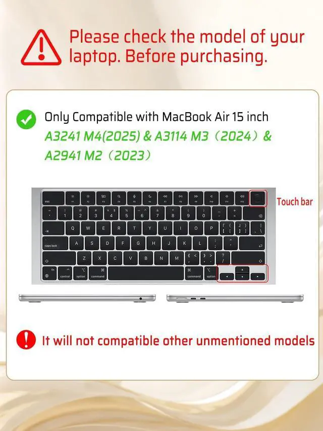 Model: Designed ONLY to be compatible with MacBook Air 15 inch M4 M3 M2 Chip with Liquid Retina Display & Touch ID 2023 2024 2025