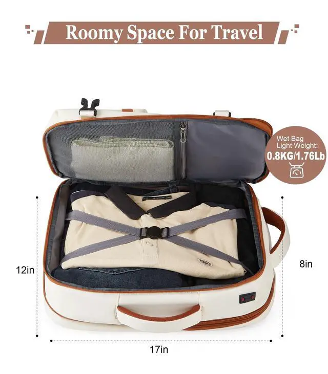 Backpack: The TSA backpack for travel college measures 18.3 *13* 8.5 inches and weighs 0.85 kg( 1.87 lbs). This travel backpack for women men traveling features a 180 degree zipper closure to help you pass through security check quickly, compliant with airline carry-on requirements. Can be a personal item travel bag fits overhead bin or under the seat and save on paying any extra baggage fees. ^^ Makes travel backpack designed with multi functional pocket for 5-7 days travel necessities. It has main pocket, wet clothes pocket, interior pocket, side pockets, laptop compartment, organized pocket, front pockets 17.3 inch laptop and 12.9 ipad. The built-in elastic bands of main pocket keep your clothes from falling. ^^ The back is a honeycomb design, ergonomic back airflow design. Soft and breathable shoulder straps and back foam help reduce stress on your back while traveling. Shoulder straps are padded and widened so they don't feel tight. The personal item traveling backpack for airplane features a fully high-density waterproof wet pocket can help you to separate wet clothes or towel after stay in a hotel or apartment more convenient.