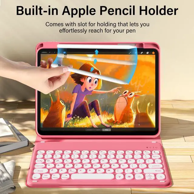 The protective shell can be placed at different tilt angles to adjust the optimal viewing angle, very flexible and user-friendly. ^^ Buit-in Pencil Slot & Sturdy PU MaterialThe ipad 11/10th generation keyboard case has a convenient right side built-in pencil slot that easy to storage and remove your pencil (Apple Pencil is Not included). Premium PU leather cover is waterproof, scratch proof and fingerprint proof, providing full protection for your beloved tablet. ^^ Practical 7-Color Backlight KeyboardThis keyboard has 7 LED backlight colors and 3 brightness options. The colored circular keycaps are very cute and personalized.