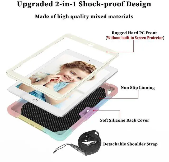 Design: This case for iPad 9th Generation is made of Premium Soft silicone rubber and hybrid hard PC + front hard PC bumper, easier to install and remove, withstands daily drop, bump and shock with four protection corner cushioning, perfect for Kids. (WITHOUT built-in Screen Protector) ^^