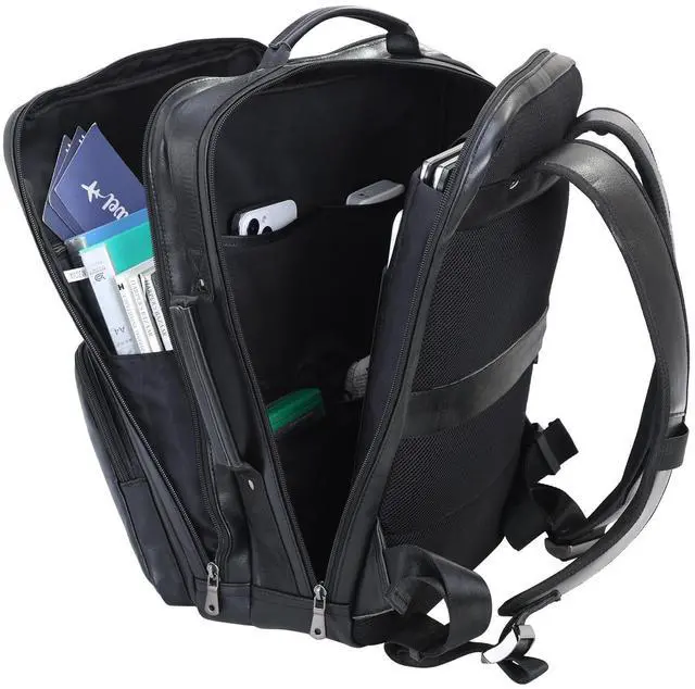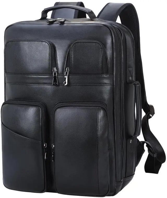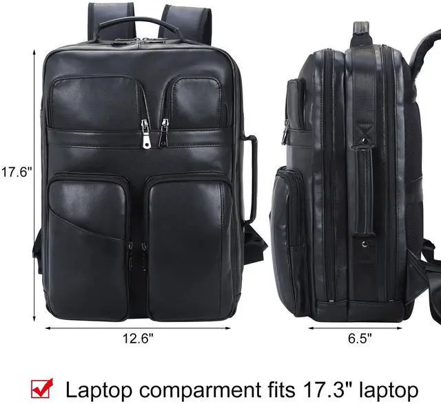 width: 3.1 inches. It owns 2 spacious compartments, 2 padded compartments fits 17.3" laptop and 12.9" tablet, 4 front zipper pockets, 2 pen holders, 4 card slots, 5 slip pockets, 1 interior zipper pocket and 1 hidden back zipper pocket. ^^ Max Comfort AssuredThe backpack's back and shoulder straps are designed with comfortable padding, which provides you with great back support and easy to carry around all day. Feature a back sleeve that slips over extended luggage handle to make your trip easier. ^^ MultipurposeThis large black leather backpack can meet your various needs of daily and travel, suitable for outdoor activities, business, hiking, camping, weekender and overnight. It's a great present idea for men on birthdays, anniversaries, Father's Day, Valentine's Day, Thanksgiving, Christmas, and New Year. ^^ Purchase with ConfidenceWe provide 1 Year Quality Commitment and Excellent Customer Service! If you have any problems with our products, please reach out and we take care of all quality-related issues.