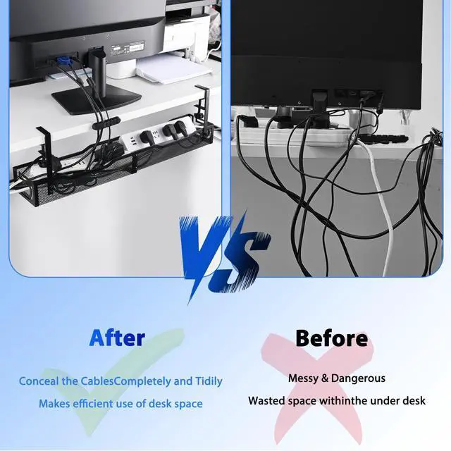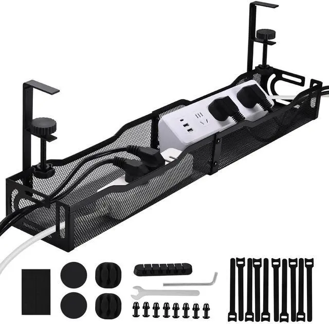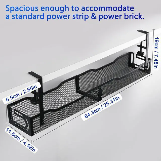 Large 25.3 Inch Under Desk Cable Management BoxThis extra-large 25.3 inch under desk cable management box provides ample space to hide power strips, surge protectors, chargers, and messy cablesperfect for creating a clean and organized workspace. ^^ Clamp-Mounted Installation with Anti-Slip Pads No Drilling RequiredSecure the organizer using heavy-duty adjustable clamps that fit most desks. No drilling, no adhesives, and no surface damage. The included anti-slip pads protect your desk and prevent shifting during daily use. ^^ Heavy-Duty Metal Cable Organizer for Office & HomeBuilt with durable steel, this under desk wire organizer easily supports multiple power bricks, USB hubs, chargers, and adapters.