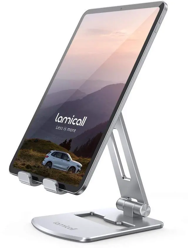 New Design As a professional stand manufacturer, Lamicall made market research to find the real needs of customers and then developed this fully adjustable tablet stand with superior stability. A perfect iPad desktop stand accessory that frees your hands to watch videos, use Facetime, view recipes and enjoy games. ^^ Light weight & Sturdy Thanks to high-quality aluminum alloy and the larger heavier base, Lamicall desktop ipad charging dock stand provides solid support to hold your tablet in the upright position without falling over like others. ^^ Foldable Design Dual-hinge adjustment, this multi-angle tablet holder can provide more viewing angles you want.