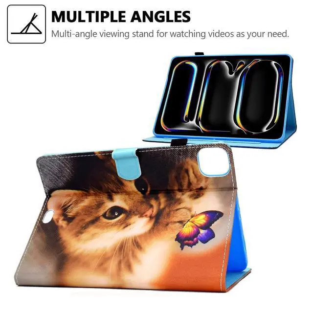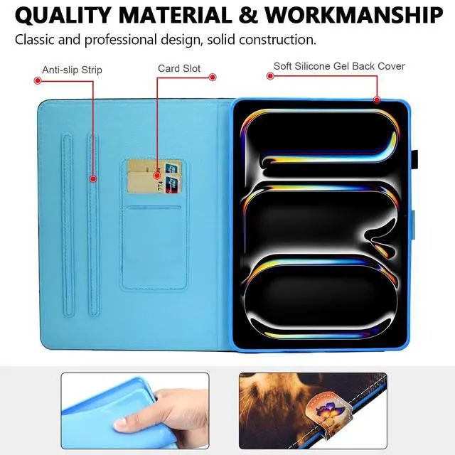 Features: 1) Quality synthetic leather exterior & soft flexible silicone interior, gives all-around protection and easy installation. 2) Interior with 3 card slots, so convenient to hold a variety of cards (ID, credit cards or business cards). 3) Designed with an elastic loop for holding your Apple Pencil Pro. 4) Anti-slip stand feature, offers free-hands reading or watching movies on the desk. 5) Auto wake & sleep function, open to wake your tablet & close to put it sleep, saving more power. 6) Precise openings, easy access to all ports and buttons without removing this protective case. 7) Powerful magnet folio case, keeps the front cover sealed. Ideal for home, office and travel.
