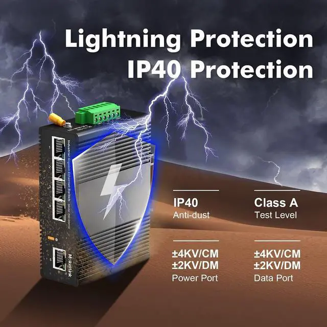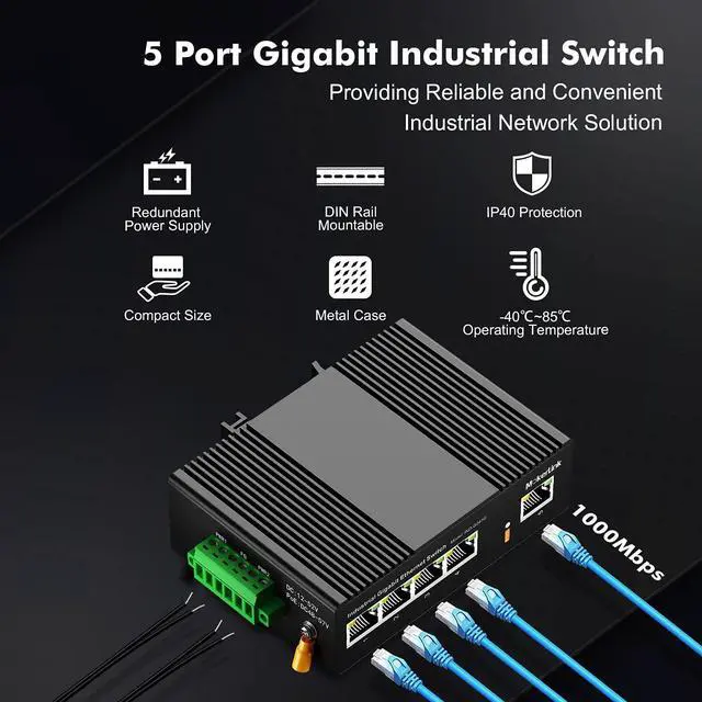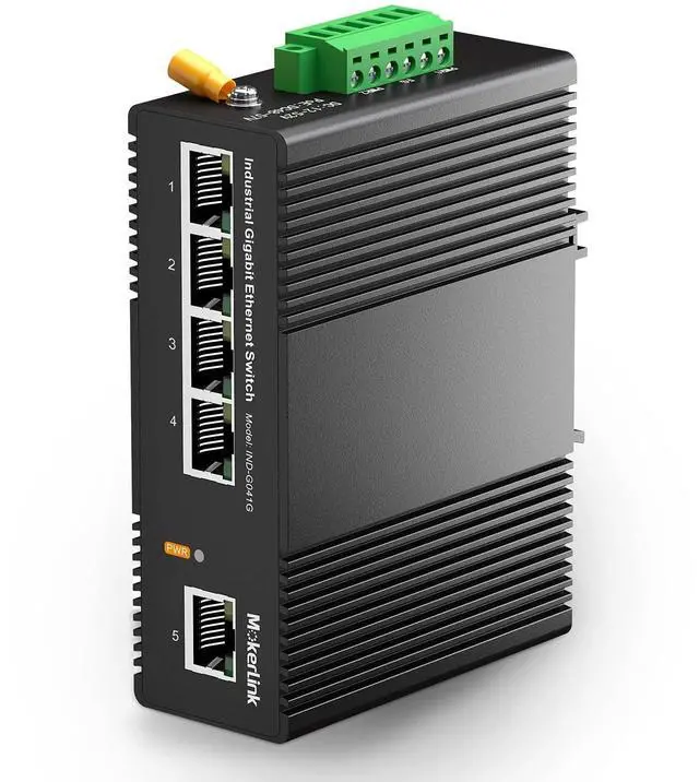This network switch include 4 gigabit ethernet ports and 1 gigabit uplink, all ports support 10/100/1000Mbps rate, switching capacity up to 14Gbps, with better data performance ^^ The shell is made of industrial-grade aluminum alloy, which is more sturdy, surface groove design, better heat dissipation, integrated DIN-rail mount kit, installation and disassembly are very simple ^^ IP40 protection grade, working temperature -40~75C(-40~185F), super robustness, anti-lightning, anti-static and anti-overload protection, adapt to various harsh environments ^^ Dual power supply, automatic fault switching, anti-reverse connection does not damage the equipment, higher reliability, equipped with one UL-certified power adapter, can be used without additional purchase ^^ Support auto-negotiation, plug and play, no configuration needed, low-power consumption CPU, no fan quiet operation, green energy saving, suitable for various networks, such as home office, computer room, warehouse, factory, compact control box and other industrial scenarios with Ethernet access