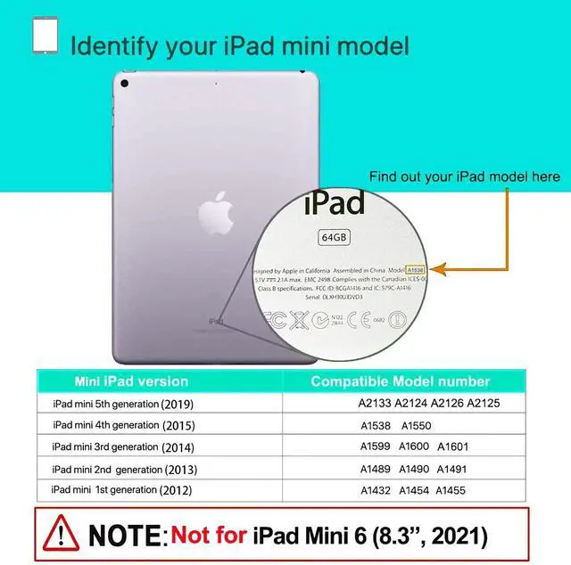 Compatible with iPad mini 5th generation 2019 release(Model: A2124 A2126 A2125 A2133), iPad mini 4th generation 2015 release(Model: A1538 A1550), iPad mini 3rd generation 2014 release(Model: A1599 A1600), iPad mini 2nd generation 2013 release(Model: A1489 A1490 A1491), and iPad mini 1st generation 2012 release(Model: A1432 A1454 A1455).