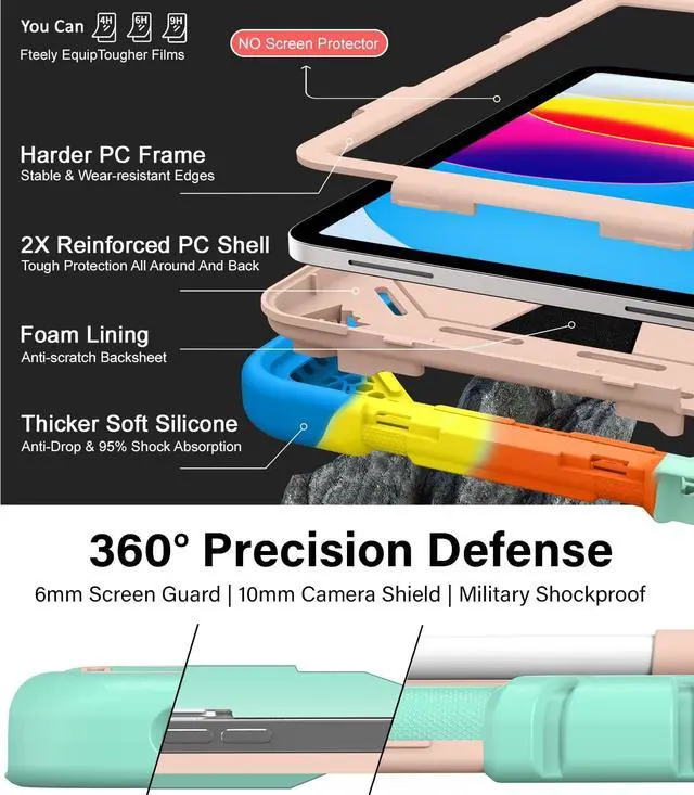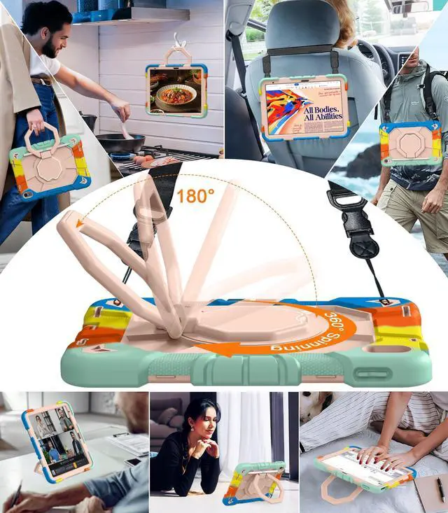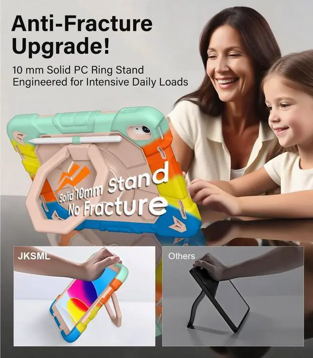 Generation 10.9 -inch (2022): Models A2696/A2757/A2777. Confirm back "A" number before choosing this case to protect your investment. ^^ Military-Grade Shock AbsorptioniPad 10.9 inch 10th gen case with reinforced PC frame and thickened silicone absorbs massive impacts, guarding against corner drops and bumps during travel or kids' playbuilt to survive bumps like a tank. ^^ 360 Precision DefenseiPad 11th generation kids case features raised bezels to shield the screen from frontal drops and a deeper camera cutout to protect lenses. Added foam lining inside the iPad 11/ 10.9 inch case prevents scratches, defending your device from daily chaos. ^^ Anti-Bending Ring StandiPad a16 case with a reinforced PC core withstands 10, 000+ rotations and extreme temperatures. This tank-tough ring stand resists cracks and warping, made for heavy-duty daily use. ^^ Dynamic Grip, Carry & View360Rotating & 180Folding ring stand enables it grip One-handed or hook somewhere + adjust 20-80for drawing/typing/viewing. Adjustable detachable strap frees hands- Perfect for Campus, Home or Travel. ^^ Perfect Fit & Pencil HolderiPad 10th gen case for kids offers precise cutouts for all portsuse and charge like a bare iPad. The back slot locks your pencil securely, ending lost-pen panic whether for kids or travelers.
