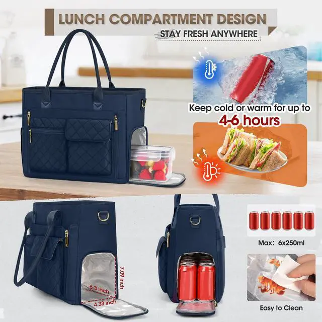 Insulated Lunch Compartment & Leakproof: The teacher tote bag features a lunch compartment on the side that can keep food warm for up to 4 hours and cold drinks for up to 6 hours. The high-quality insulated layer of the lunch compartment keeps the food fresh and warm at work, and is easy to clean. Whether its drinks or food scraps accidentally spilled, wipe with a wet cloth. It could accommodate 6*250ml cans. Lunch tote bag is ideal for nurse, teacher, office worker carrying lunch to work. ^^