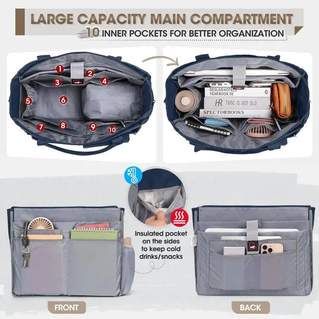 Large Capacity & Multiple Pockets: The laptop bag for women with over 15 pockets can easily hold all your daily necessities. The main compartment has a padded sleeve for 15.6" laptop & 12.9" iPad, plus 6 open slots and an insulated bottle pocket. The dual-layer front organizer offers quick access- the outer layer has a flip-top and zippered pocket, and the inner layer contains 1 open pocket, 4 elastic loops, and 1 mesh pocket. Side lunch pocket keeps food fresh; A back pocket for documents.