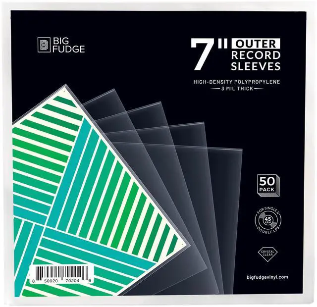 MAXIMUM TRANSPARENCY Big Fudge offers the best way to exhibit your precious vinyl record collection with our crystal clear outer sleeves. Made from high-density polypropylene, our sleeves are transparent and dont cloud easily unlike industry standard sleeves that are made from polyethylene. ^^ SAFEGUARD YOUR VINYL We know how you much you care about your collection. Our cover sleeves are 3 mil thick, more than enough to keep your precious vinyl from dust, scratches, or any kind of blemish that might ruin their condition. ^^ PERFECT STORAGE FIT Storing your vinyl is a breeze with our outer sleeves.