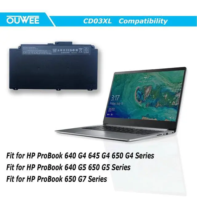 Capacity: 48Wh 4212mAh. ^^ Compatible Part NumberCD03XL HSTNN-LB8F HSTNN-IB8B HSTNN-UB7K 931702-421 CD03 CD03048XL CDO3XL 931702-171 931702-541 931719-850 HSN-114C-4 HSN-114C-5 HSN-115C. ^^ Replacement For LaptopHP ProBook 640 645 650 G4 ProBook 640 650 G5 ProBook 650 G7 Series Notebook. ^^ ConnectorBefore placing your order, Please refer to the picture and check it. Because the products produced by different factories will have differences, such as size, cable length, interface, etc. ^^ Use SkillsIf the new battery is not recognized during the initial installation, please reinstall and check if the interface is fully connected. Discharge the new battery to 5% (not 0%), then charge and cycle 3-4 times to wake up the new battery.