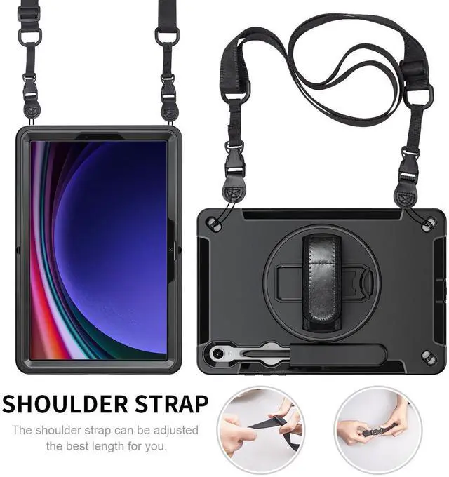 Kickstand ]: For the new design kickstand, our galaxy tab s9 case fits into infinite viewing angles. Easier to type and more comfortable to enjoy videos. The kickstand also equipped with small close button. ^^ [ Detachable & Adjustable Shoulder Belt ]: Very Convenient and Safe to carry your galaxy tab s9 with shoulder belt to wherever you want. And The length of the shoulder belt is friendly for both kids and adults.