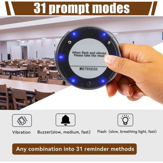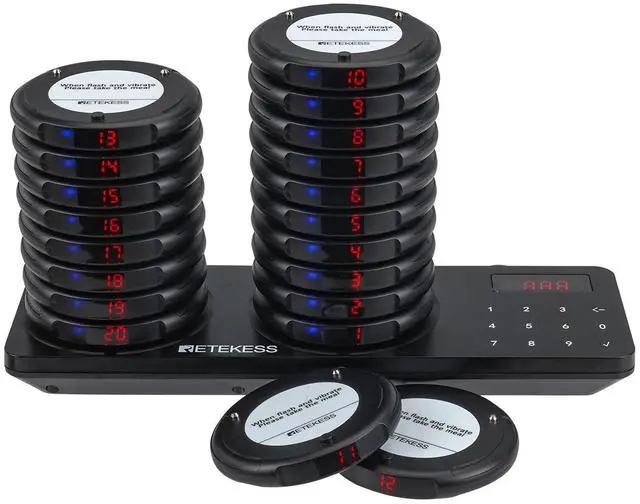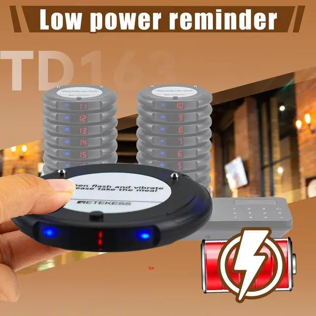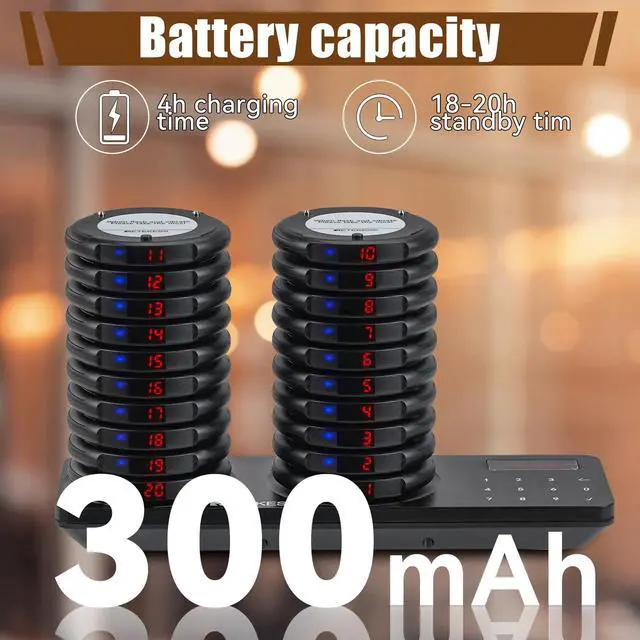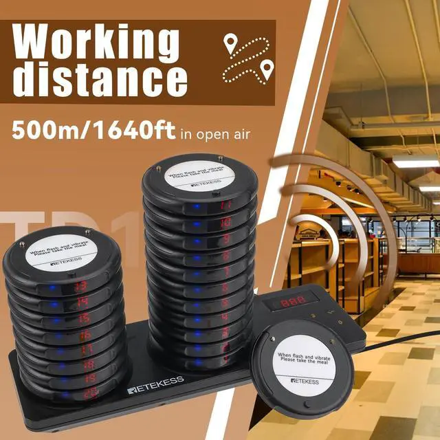 Long distance; food pager system working range can reach 1312-1640ft in open areas and 328-984ft indoors; customers can wait in a comfortable area or in their own car ^^ Quick pickup for guests; pagers has no close option and needs to be returned to the bottom seat to turn off the sound; less hassle with food piling up at the front desk ^^ Easy to use; the church nursery pager system already set up from in the box; plug in and play without complicated setting; reduction of study time ^^ Add up to 998 pagers; as it expands, more menu boards can be added to meet usage requirements; you can expand your business easily ^^ 31 prompt modes; buzzer; vibration and flash can be combined at will; different alert modes can be selected depending on the environment; for example, sound can be selected for food courts; silent mode can be selected for churches