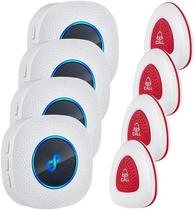 ^^ Convenient Installation4 receivers 4 call buttons, no wiring required, ready to use out of the box. Just plug in the receiver and stick the wireless call button within reach. It also comes with a lanyard that can be hung around your neck so that your family or patients can seek help anytime, anywhere. ^^ Applicable PlacesThe elderly, disabled or patients can call caregivers through the call button and get timely help without shouting for help. Caregivers also dont need to be with the patient all the time, while protecting the independence and privacy of loved ones.