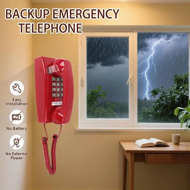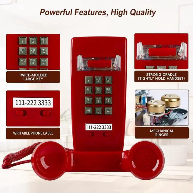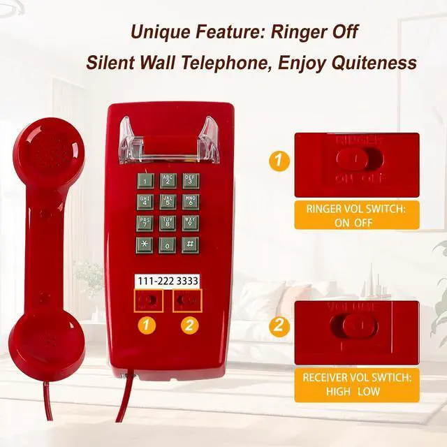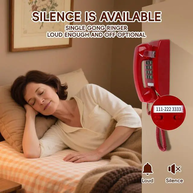 Classic Design, Ringtone Can Turn OffThis red vintage wall phones for landline keeps the American Classic design, including the color, the metal base, mechanical ringtone, the push button, etc. But the Ringer Can Turn Off, which can be silent if you want, which is necessary especial in night. It can be Silent Wall Phone. ^^ Easy to Install, Powerful CompatibilityThe corded 2554 wall telephone is powered by telephone line, requires no batteries or external power supply, ensuring reliable communication during power outages. It's compatible with the major telephone system including PSTN and VoIP.