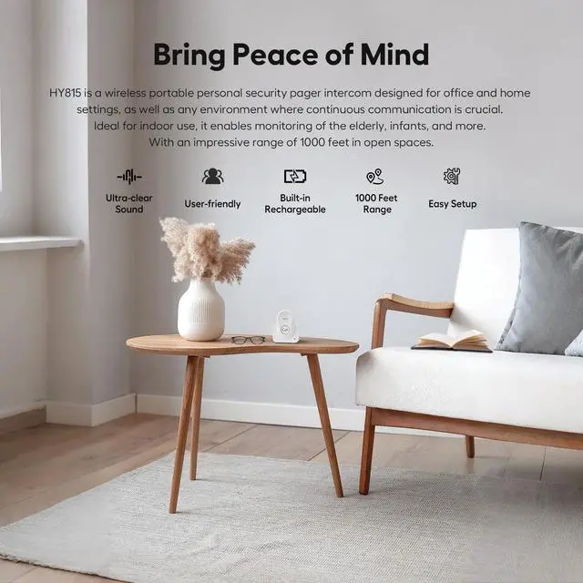 User-Friendly DesignEasy to use. The pager intercom is designed for instant usesimply plug and play. Its straightforward and hassle-free, requiring no complex setup or pairing. Both call fuction and monitor fuction are easy to use. ^^ Portable and RechargeableConvenient to carry, the wireless intercom can fit in a pocket or be worn around the neck like a pendant, with a neck strap included. Equipped with a built-in 600 mAh polymer battery and a charging base for added convenience. ^^ Long RangeOperating at a range of 1000 feet in open areas, the HY815 home intercom system can also cover distances of up to 300 feet in indoor settings with obstacles, making it suitable for use in various rooms like upstairs and downstairs, living rooms, kitchens, and studies.