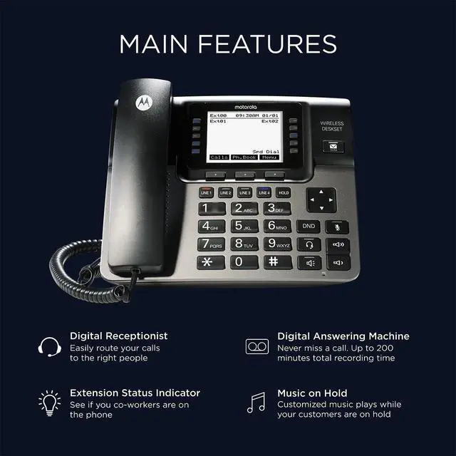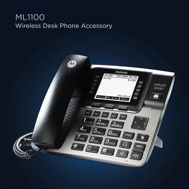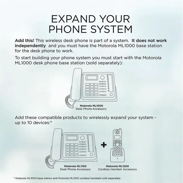 Building a system is easy! Build a system of up to 10 ML1100 desk phones and / or ML1200 cordless handsets (sold separately) with one phone jack. Connect deskphones and cordless handsets - all wirelessly. This wireless desk phone is part of a system. It does not work independently. You must have the Motorola ML1000 Base Station for your phone system to function.