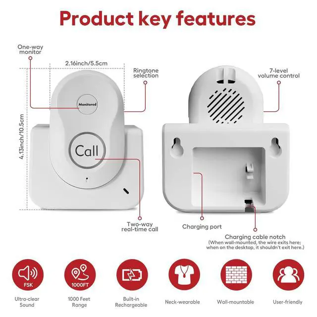 User-Friendly DesignThe pager intercom is designed for instant usesimply plug and play. Its straightforward and hassle-free, requiring no complex setup or pairing. And it includes the monitor function. ^^ Two-Way CommunicationThe Caregiver Pager provides freedom for both caregivers and patients/elderly/pregnant women/handicapped/kids/sick individuals to call for help at home without the need to raise their voices. ^^ Portable and RechargeableConvenient to carry, the wireless intercom can fit in a pocket or be worn around the neck like a pendant, with a neck strap included. Equipped with a built-in 600 mAh polymer battery and a charging base for added convenience.