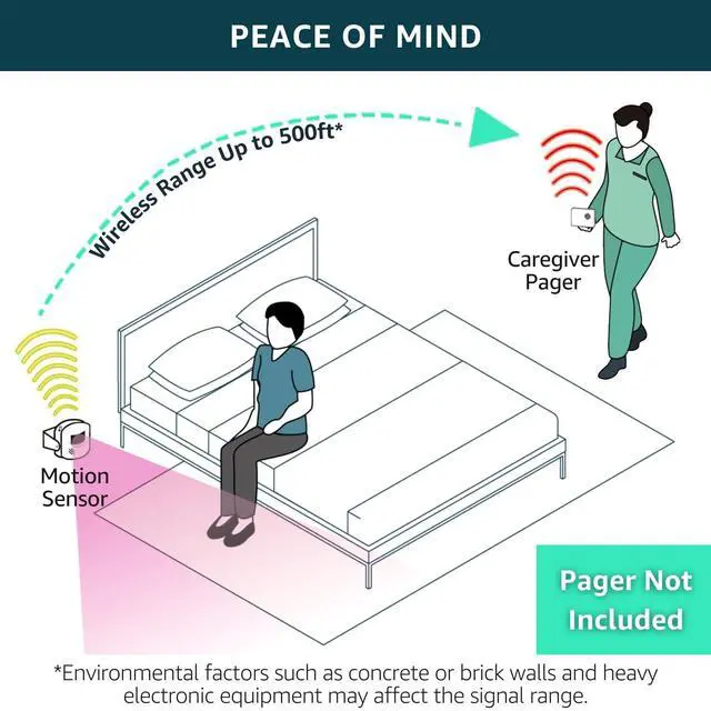 ^^ ALLOW CAREGIVER FREEDOM: With up to 300 feet operating range in open areas, the wireless motion sensor is silent as bed alarm in residents or patients room. ^^