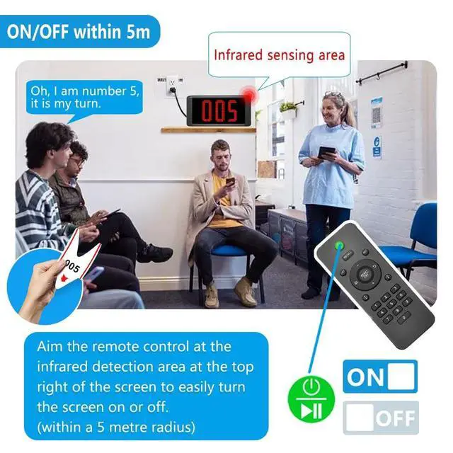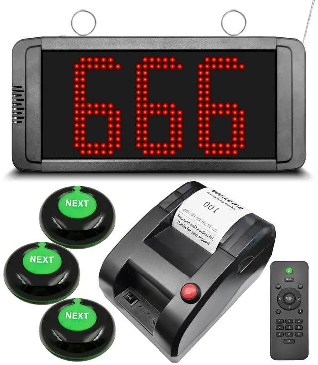 NEXT Call Button: When the "NEXT" button is pressed, the indicator will light up and the number will automatically go to the next one. It makes our queue management system simple and easy to use. The transmission distance can be up to 100-150 meters in open space, and the signal distance indoors will be affected by obstacles such as doors, windows and walls, about 30-50 meters.