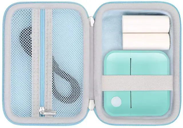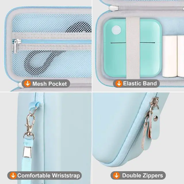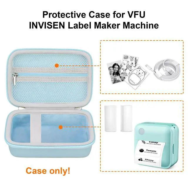 (Note: case only, label maker and accessories are not included). ^^ Security Protection This vfu mini sticker printer case is made of durable hard EVA material which is shockproof, splashproof, semi-waterproof and anti-stain, protecting vfu label maker/ invisen sticker maker from damages caused by indoor or outdoor activities. The surface of hard EVA shell case is also easy to clean, keep INVISEN/ VFU label printer tidy and let you enjoy fun of printing. Soft velvet interior lining keeps device free from scratches. ^^ Exquisite DesignThis vfu label printer case with a mesh pocket that can hold USB cables, multiple mini cute stickers and crayons for to easy storage and use. Elastic band keeps invisen label printer firmly in one place without worrying about it sliding and damaging. The etra space of mini label printer case can store rolls thermal papers. Double zippers that you can open and close freely and smoothly in multiple directions. ^^ Portable Label Printer Case The vfu label printer case comes in a detachable wristband so you can easily carry vfu label maker case to go anywhere or hang the VFU label maker/INVISEN sticker maker up when not use.
