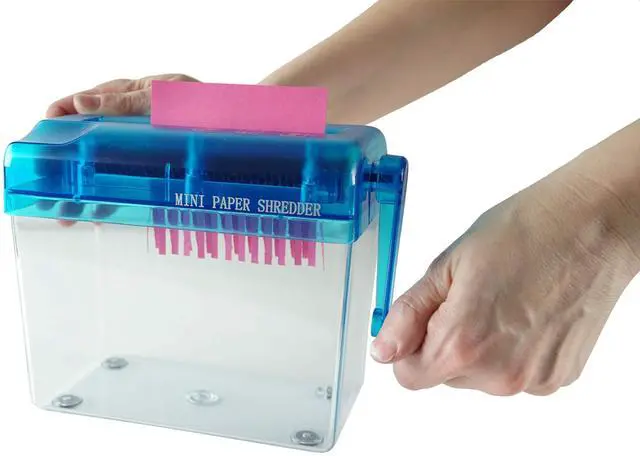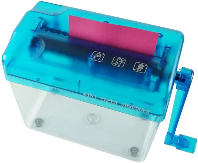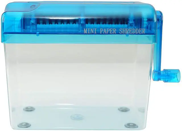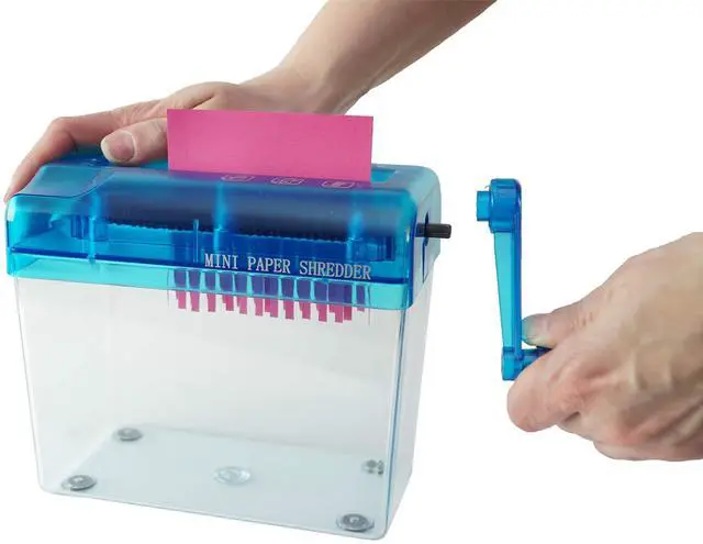 This hand-operated paper shredder is a great tool for shredding paper at home, at work, or in the classroom. Its made with durable plastic and is attached to a transparent dust box to help reduce messes. Cut and shred paper documents with ease. You dont even need to plug it in! Simply crank it with your hand to shred any paper in seconds. This shredder is an essential tool to keep information secure before you throw your documents in the garbage or recycling bin. Its important to keep your records private, and disposal of unshredded paperwork can lead to a security breach.