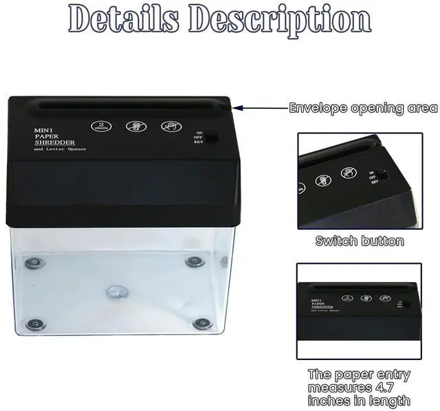 Not only does this mini shredder support A6 paper, but it can also handle folded A4 paper, receipts, and invoices. Its wide range of usability makes it ideal for both personal and professional use. Cleaning up is a breeze with the detachable working and waste compartments. Easily dispose of the shredded paper without any hassle. The built-in letter opener adds an extra touch of convenience and safety, allowing you to easily open envelopes without risking any harm. Get rid of clutter and protect your sensitive information with the electric mini A6 paper shredder.