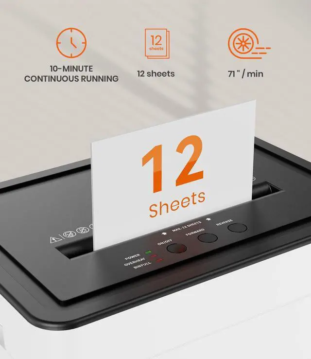 HIGH-SECURITY LEVEL P-4- Shreds up to 12 sheets of paper into tiny particles measuring 5/32" x 15/32" (4mm x 12mm), achieving P-4 high-security level for maximum protection of your information. ^^ FAST SHREDDING SPEED- Shredding at a speed of 71" per minute ensures efficient and quick disposal of documents. Operating at a quiet 58dB noise level, it maintains a peaceful work environment. ^^ JAM-FREE OPERATION- Features auto start, auto reverse, and manual reverse functions, automatically reversing to clear paper jams when shredding exceeds the maximum capacity. ^^ LARGE CAPACITY- The 20L/ 5.3 -gallon pullout bin can accommodate over 300 sheets of shredded paper, reducing the frequency of emptying.
