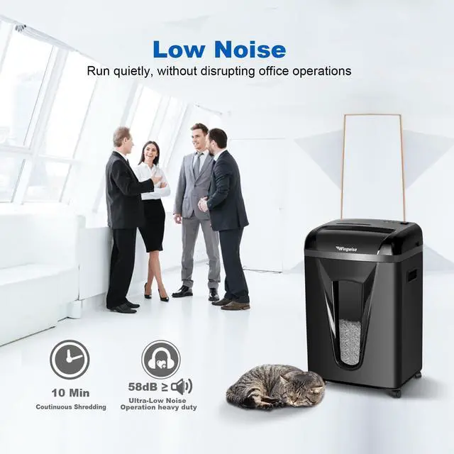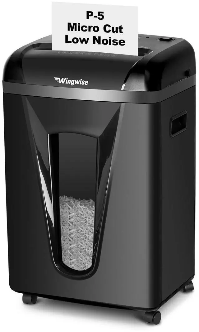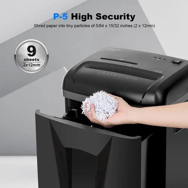 Military-Grade P5 Security Meets stringent DIN P5 confidentiality standards, shredding documents into ultra-secure 2x12mm (5/64"x15/32") particlessmaller than a grain of rice to prevent data reconstruction. ^^ High-Speed Precision Shredding Destroys 9 sheets (70g/m) simultaneously at 2.4 meters per minuteequivalent to 1.5 letter-sized pages per second for rapid, efficient document disposal. ^^ Whisper-Quiet 58dB Operation Library-quiet performance at 58 decibelsso discreet you can shred confidential materials during calls or focused work sessions. ^^ Anti-Jam Auto-Reverse Technology Smart sensors detect overloads and automatically reverse paper jams while protecting against overheating, ensuring smooth operation for up to 10 minutes continuously.