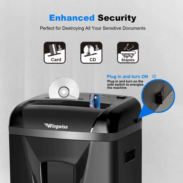 ^^ 5.8 -Gallon Visual Capacity Bin Transparent 386+ sheet bin with full-view window minimizes interruptionsshred 430+ pages before emptying (based on 9-sheet shreds). ^^ Multi-Purpose Shredding Power Securely destroys credit cards, staples, and small paper clips alongside documentsno pre-sorting required for mixed-batch disposal. ^^ NOTE! The power switch for the S3509 shredder is located on the right side of the machine. Turn on the switch, and the green light will come on, indicating it's ready for use.