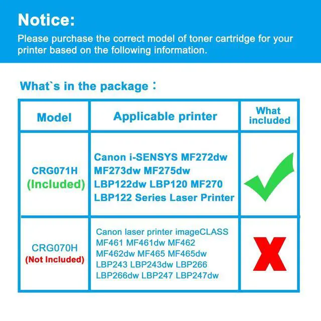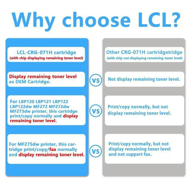 Reliable Quality: LCL CRG-071H cartridge uses high quality toner, toner particle size distribution, good mobility, high transfer rate, resulting in a clear image and high gloss print effect; Printing efficiency is high, waste powder rate is low, so as to ensure sufficient page yield.