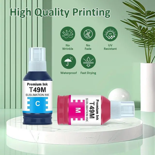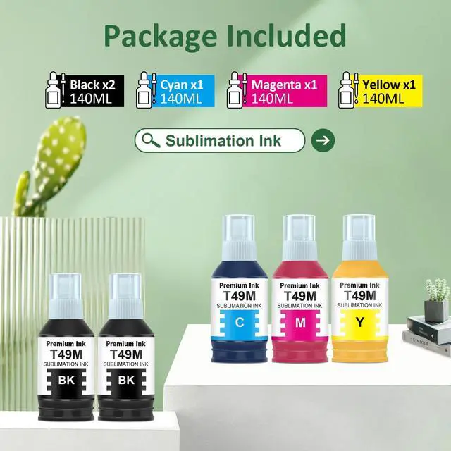 Compatible T49M Ink Bottles Includes2 x t49m1 black ink bottle, 1 x t49m2 cyan ink bottle, 1 x t49m3 magenta ink bottle, 1 x t49m4 yellow ink bottle. ^^ Compatible for Printer ModelCompatible T49M Ink Refill Bottles Replacement for Compatible for F170 F570 Sublimation Printers. ^^ Compatible T49M Approx. Page YieldThese compatible t49m ink bottle replacements for t49m each have up to 8, 000 pages balck & up to 6, 000 pages color and offer superior print performance and quality. ^^ Superior CompatibilityEach compatible t49m ink bottle undergoes quality and functional tests before leaving the factory, ensuring the printing quality of the ink bottle.