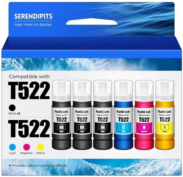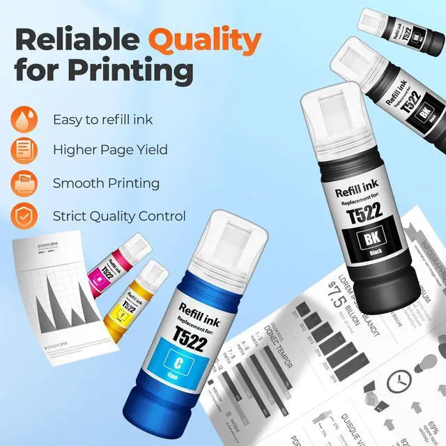 Ink Refill Bottles Page Yield: Up to 8000 Pages per T522 522 black ink, 8000 Pages per T522 522 ink bottle color combo pack, 5% coverage at A4 paper. ^^ Our 522 ink refill bottles has auto-stop nozzle design, easy filling, no spills, no drip, no need to squzze the ink bottles! Say goodbye to the hassle of manually squeezing and potentially spilling ink. ^^